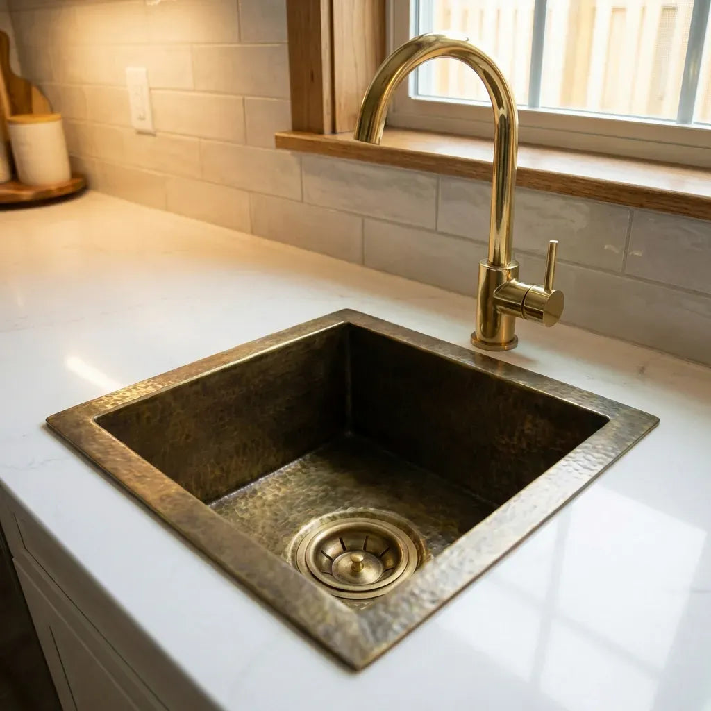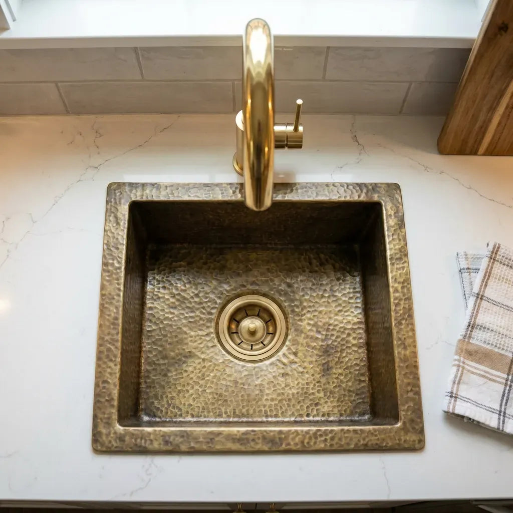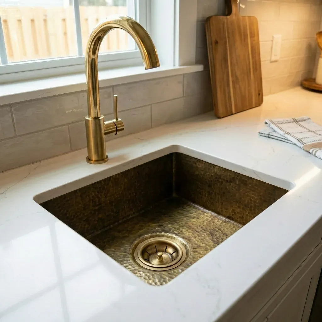 The Antique Bronze Hammered Brass Undermount Sink is a stunning and unique addition to any kitchen, offering a perfect blend of rustic charm and timeless elegance. Crafted from solid brass with an antique bronze finish, this undermount kitchen sink is designed to withstand the test of time while adding a touch of character to your kitchen space.