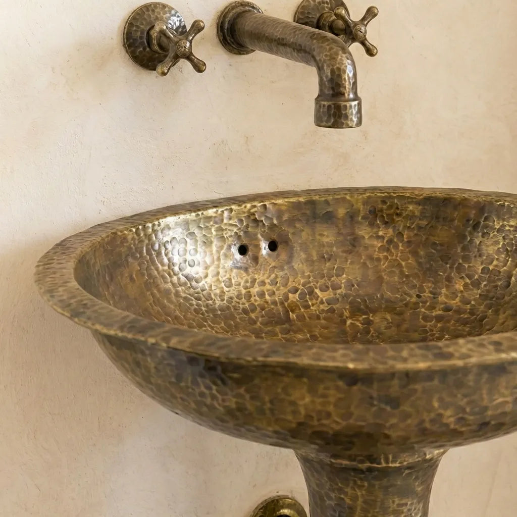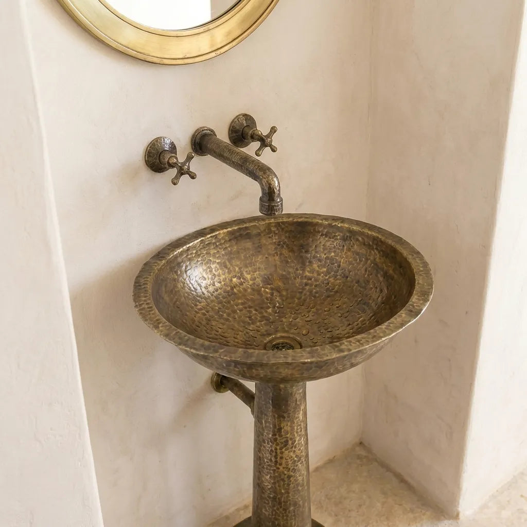 Handmade Freestanding Vintage Brass Pedestal Sink crafted from solid brass with a rich aged patina. This old-world bathroom sink delivers timeless character, durability, and a space-saving pedestal design. Unlacquered brass naturally evolves over time, making each piece unique—perfect for luxury bathrooms, powder rooms, and designer interiors. Built for daily use and fully compatible with US plumbing.