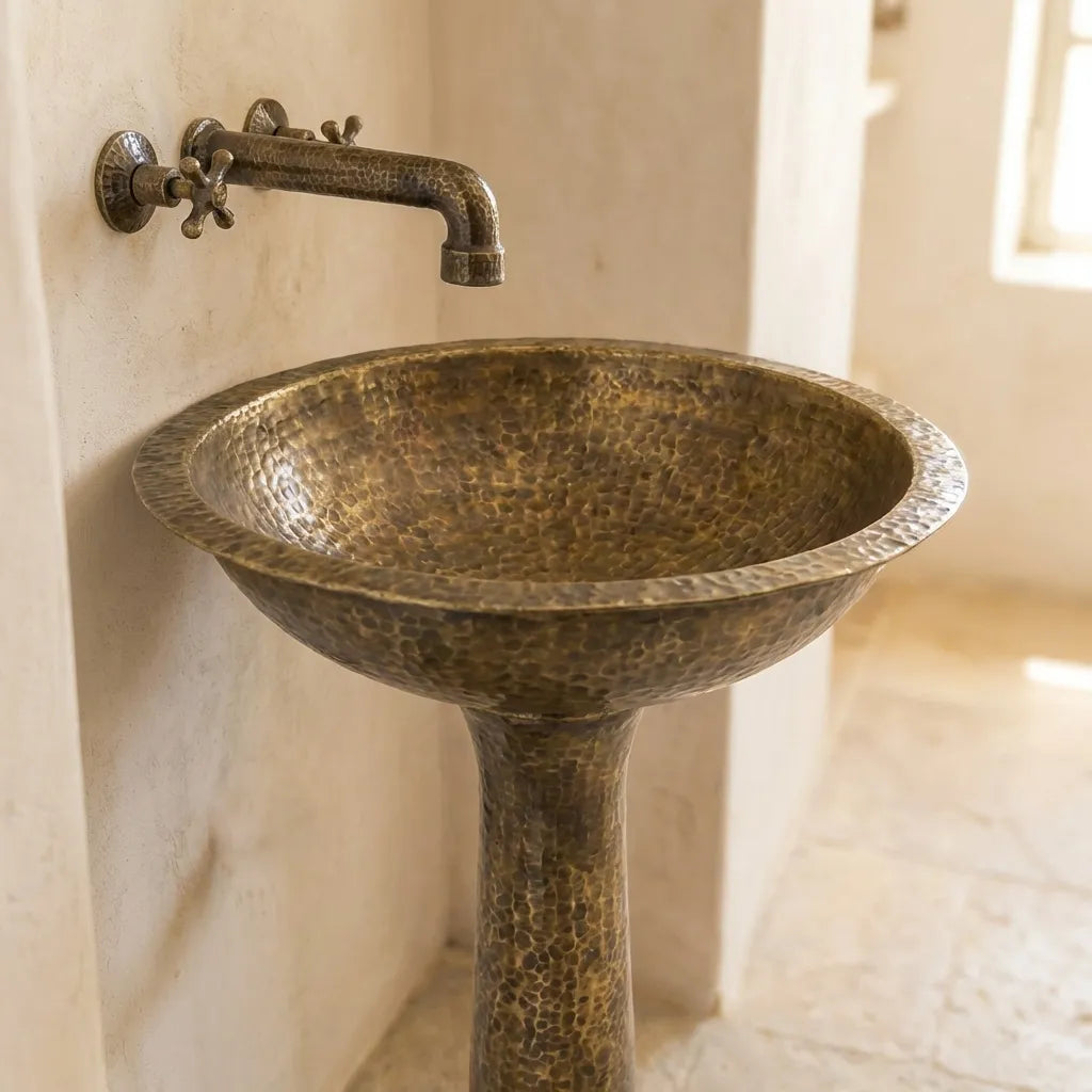 Absolutely. This old world brass pedestal bathroom sink is inspired by traditional European and heritage designs, making it ideal for riads, boutique hotels, and classic bathrooms.