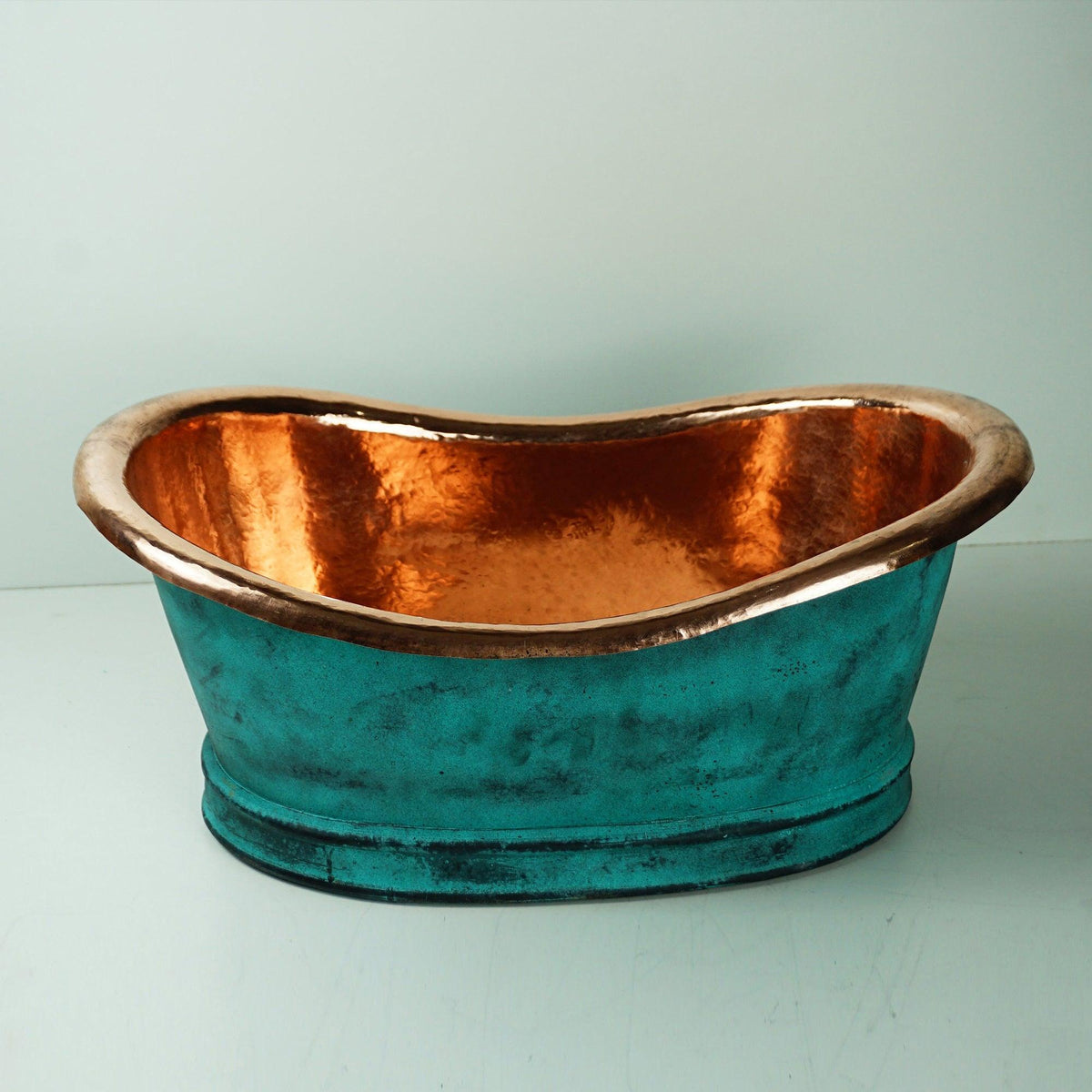 Green Patina Copper Tub-Style Bathroom Vessel Sink Vanity ;A tub-style bathroom vessel sink is a freestanding sink that is shaped like a bathtub. It is typically made of a durable material, such as copper, and it has a large basin that can accommodate multiple people.
