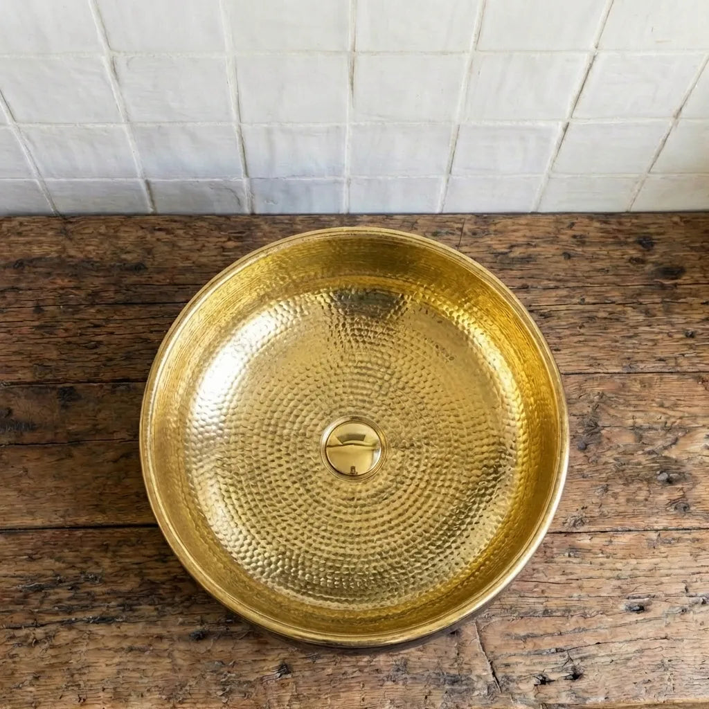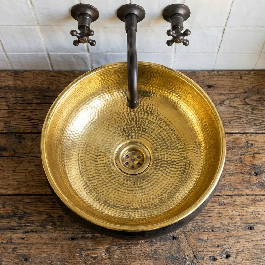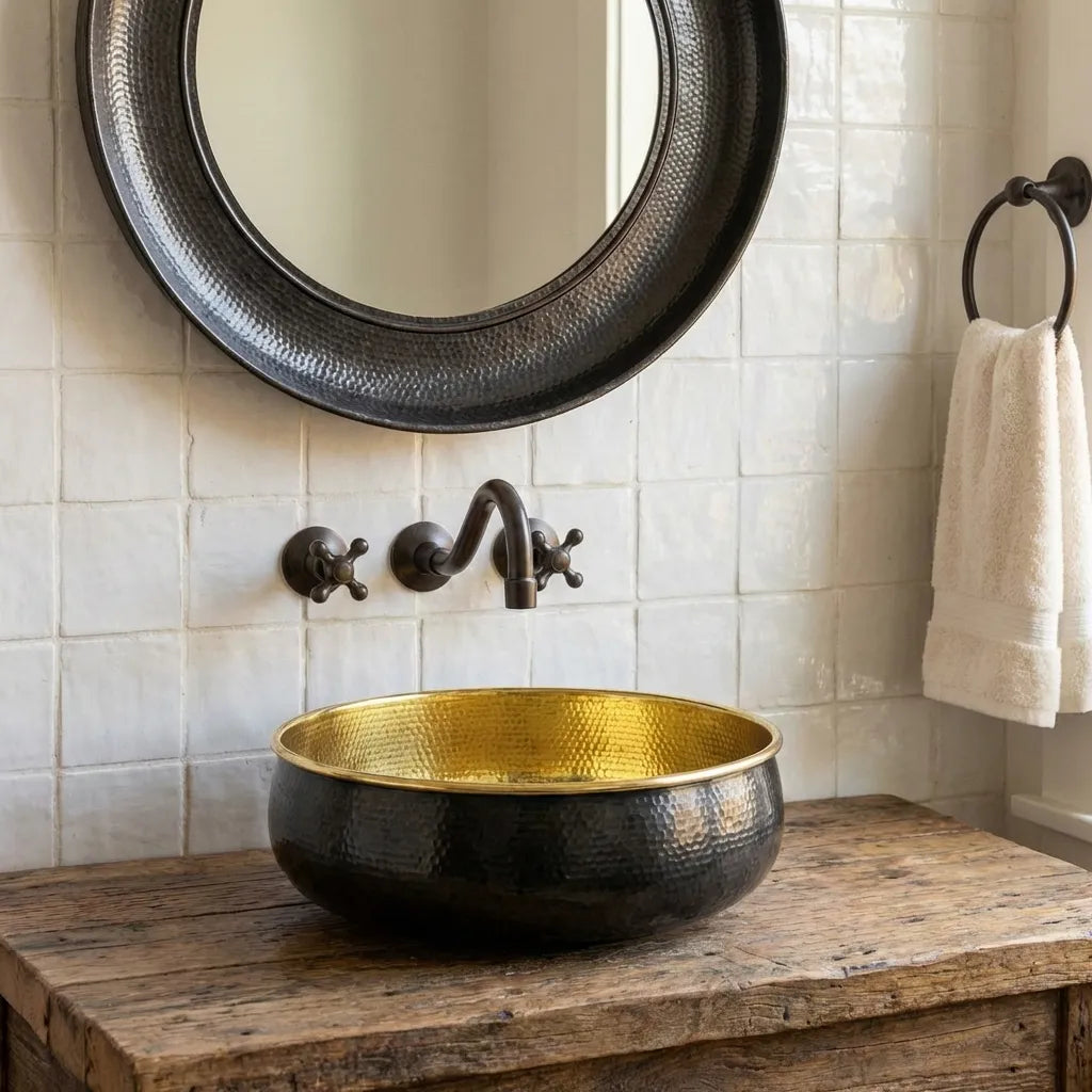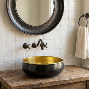 Hand-Hammered Blackened Brass Vessel Sink – Gold Interior Artisan Bathroom Basin