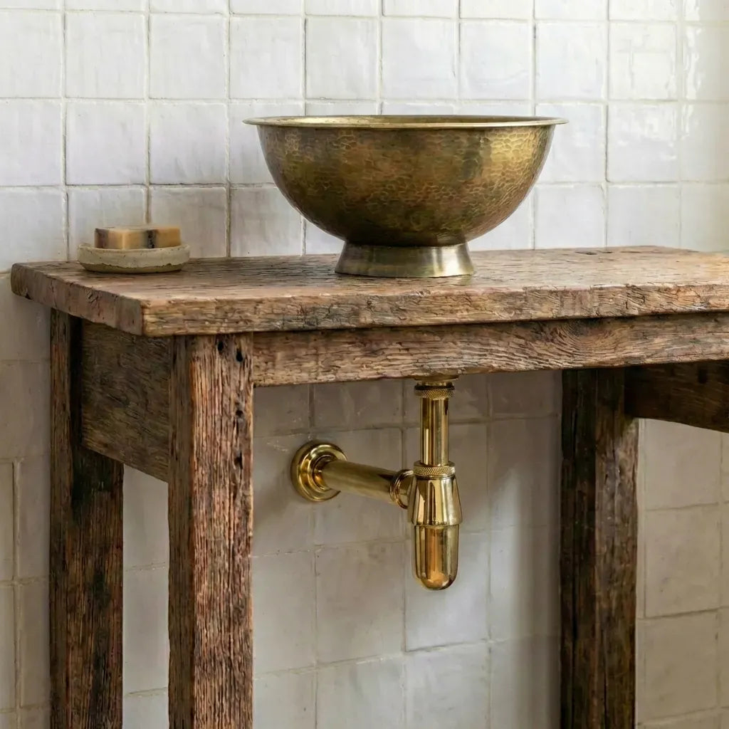 An exclusive design, This hand-hammered brass bathroom sink is designed to be over or undermounted.