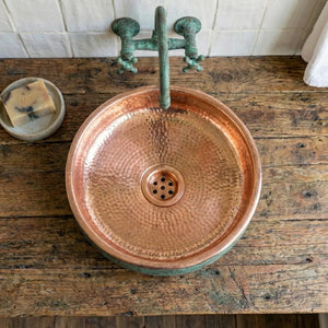 The sink is unlacquered to allow the copper to breathe naturally. This preserves the authentic oxidized appearance and ensures a truly artisanal finish.