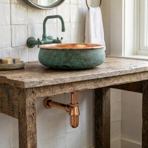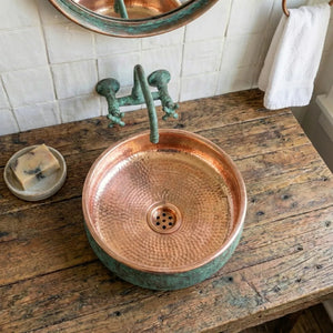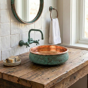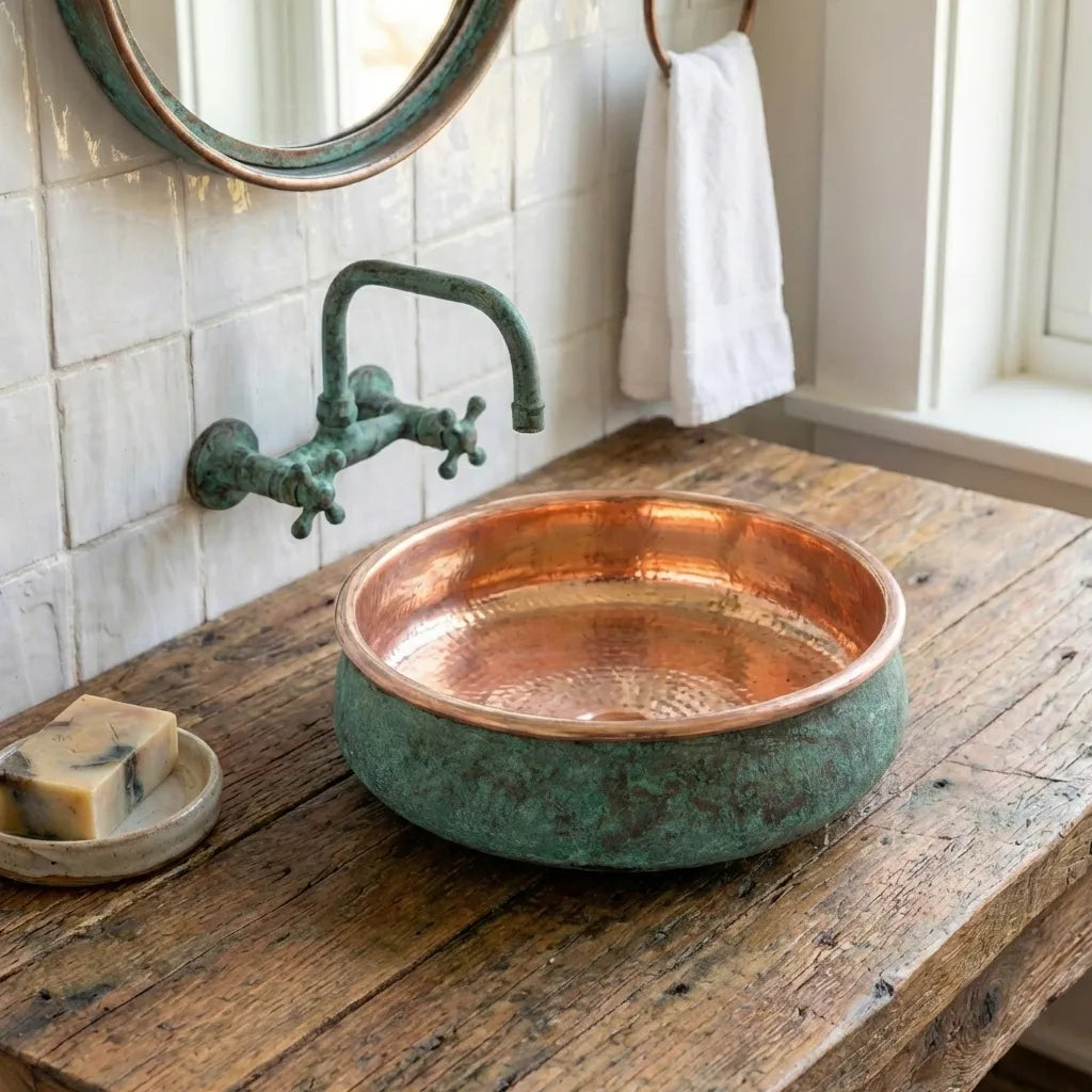 This green patina copper vessel sink combines artisan craftsmanship with rustic elegance. The hammered copper interior shines warmly, while the verdigris patina exterior adds vintage charm—making it the perfect centerpiece for any vanity.