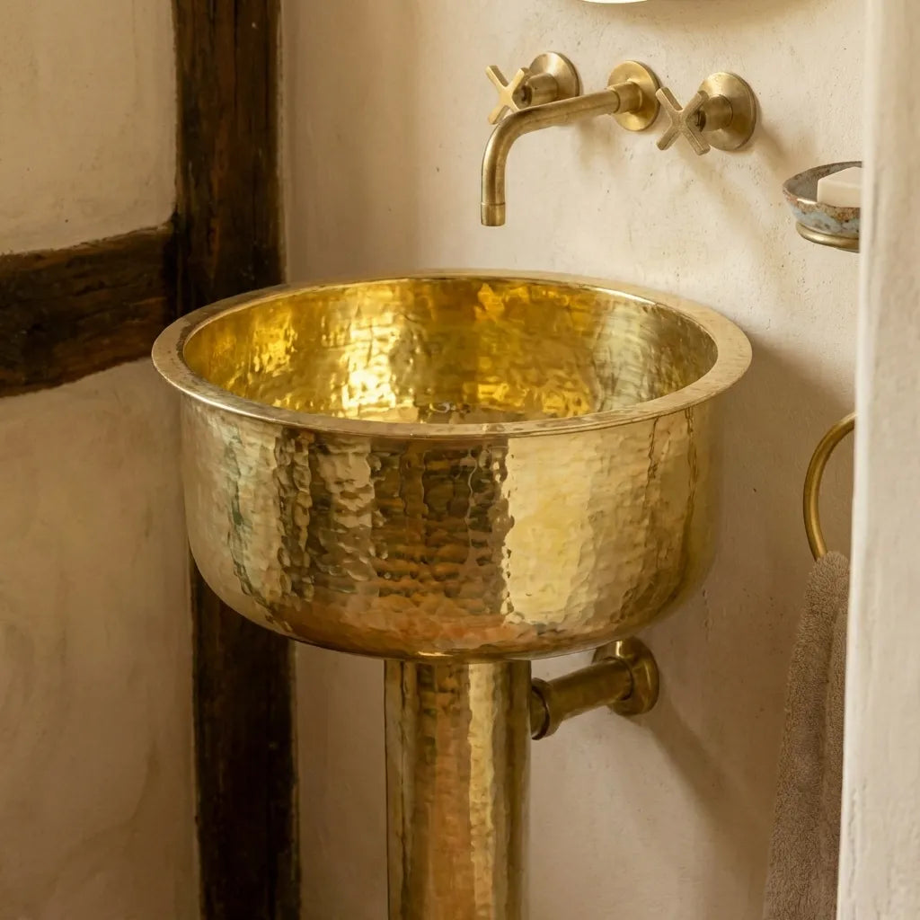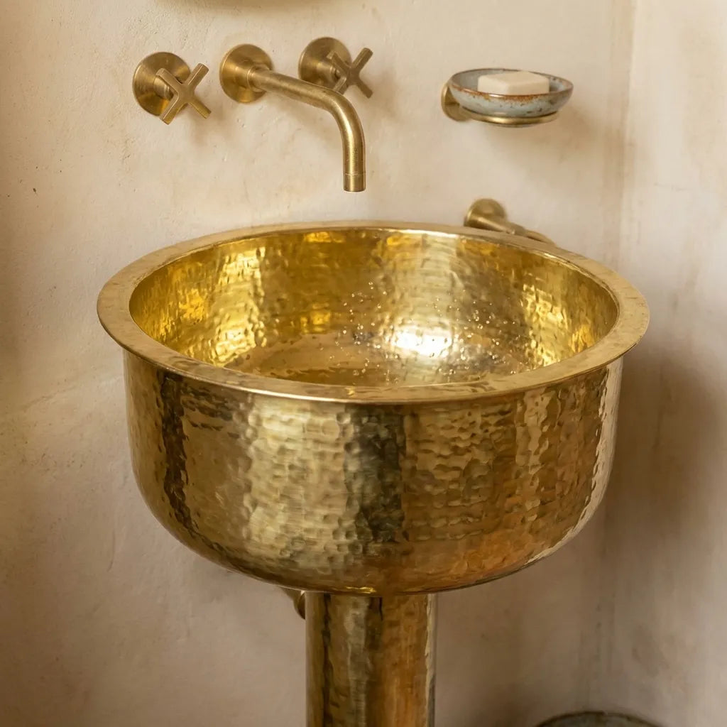 This round hammered brass pedestal sink is meticulously handcrafted from solid unlacquered brass, celebrating traditional metalwork and timeless design. The hand-hammered surface creates a rich, organic texture, ensuring each basin is truly one of a kind.