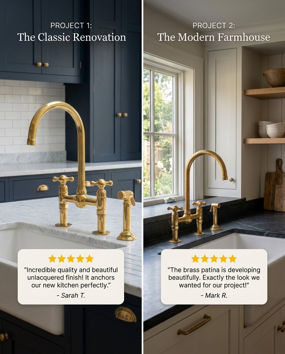 Luxury Unlacquered Brass Bridge Faucet Island Kitchen brings timeless character and solid craftsmanship to statement kitchens and central islands. Made entirely from heavy solid brass, this bridge-style faucet delivers a refined farmhouse look with a warm, living finish that naturally ages and develops a rich patina over time.