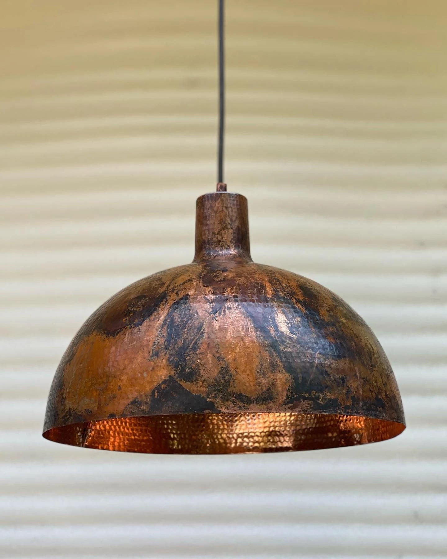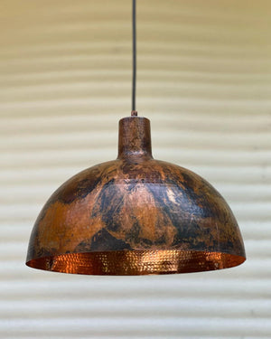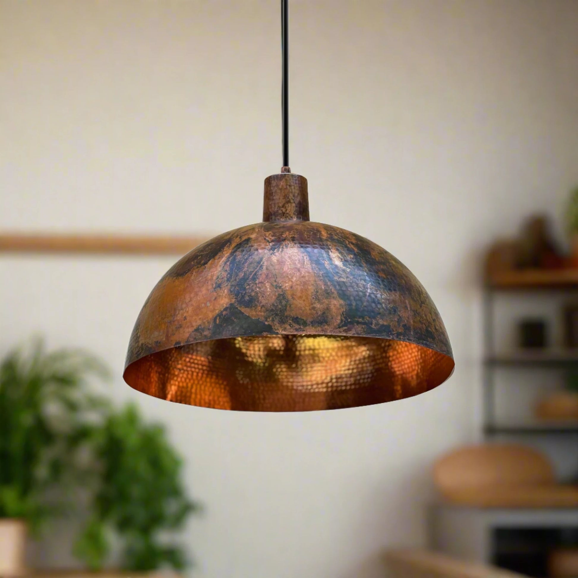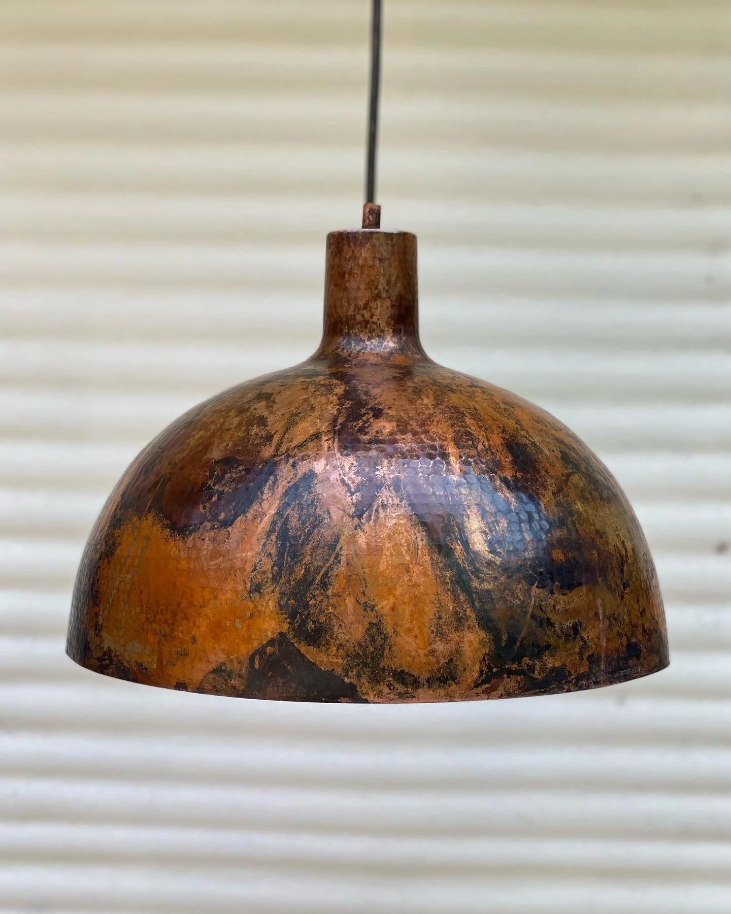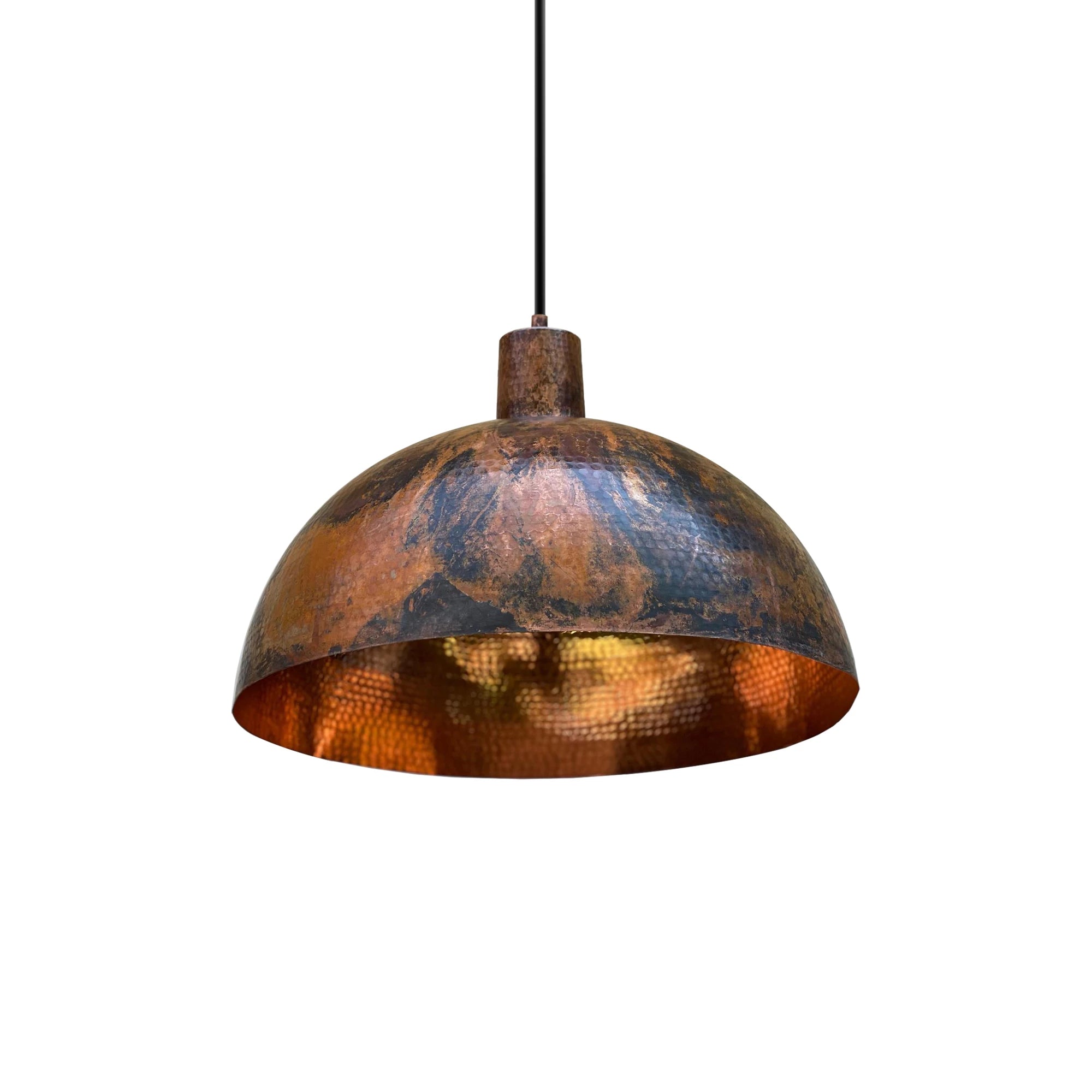 This Antique Rustic Hanging Light Copper which might look like a Hemisphere Pendant Light showcases a beautifully weathered exterior with a patina that tells a story of time and craftsmanship. The half-dome shape is reminiscent of classical design, while the textured copper with its rich, darkened patina adds an element of rustic charm. The hammered interior, glowing with a polished copper finish, casts a warm, inviting light, perfect for creating an intimate atmosphere in any setting.