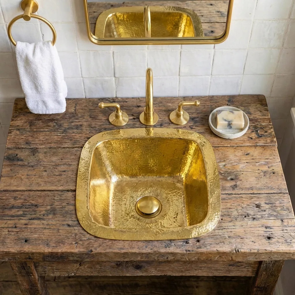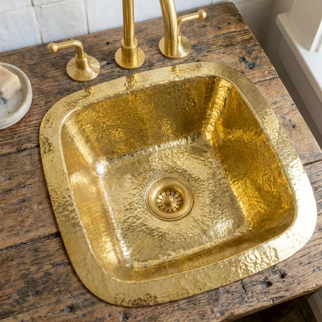 This Square Hammered Brass Undermount Sink is expertly handcrafted from solid unlacquered brass, offering a refined balance between bold character and timeless elegance. Its soft square shape with gently rounded corners delivers a clean, architectural look that integrates seamlessly into both classic and contemporary interiors.