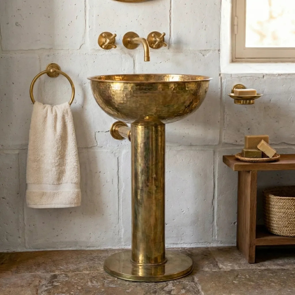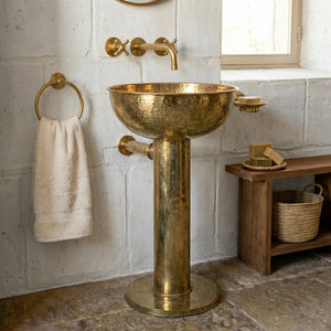 An unlacquered brass pedestal sink has no protective lacquer, allowing it to develop a natural patina over time. This living finish brass sink gradually ages into a rich vintage brass pedestal sink, highly valued in designer and artisan bathrooms.