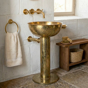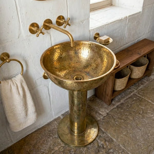 The Unlacquered Brass Round Pedestal Sink is handmade from solid brass with a refined hammered finish, offering timeless vintage character. Designed to age naturally, it develops a rich patina over time—perfect for luxury bathrooms, powder rooms, and designer spaces seeking authentic craftsmanship.
