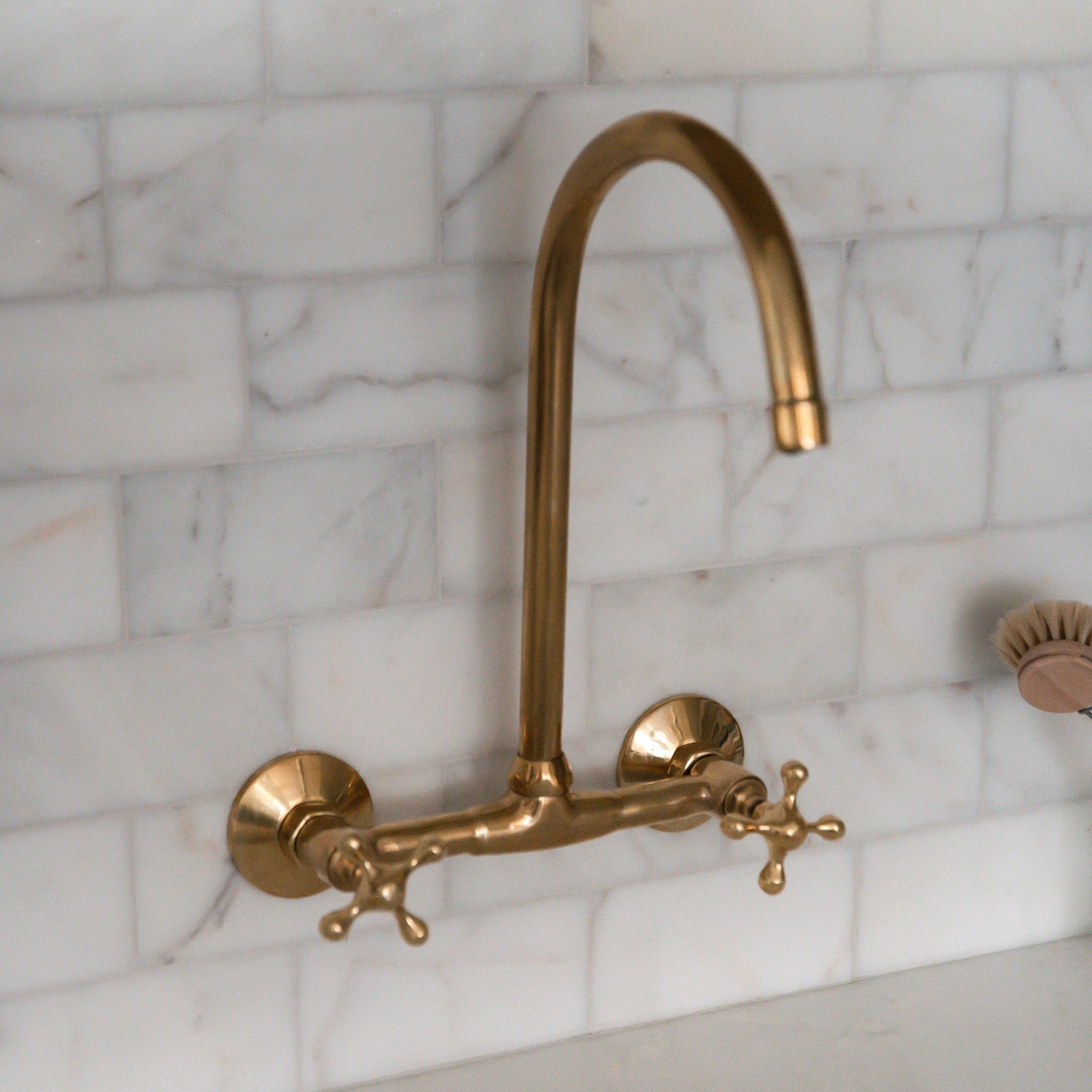 Unlacquered Brass Wall Mount Kitchen Faucet – Vintage Sink Tap with Cross Handles